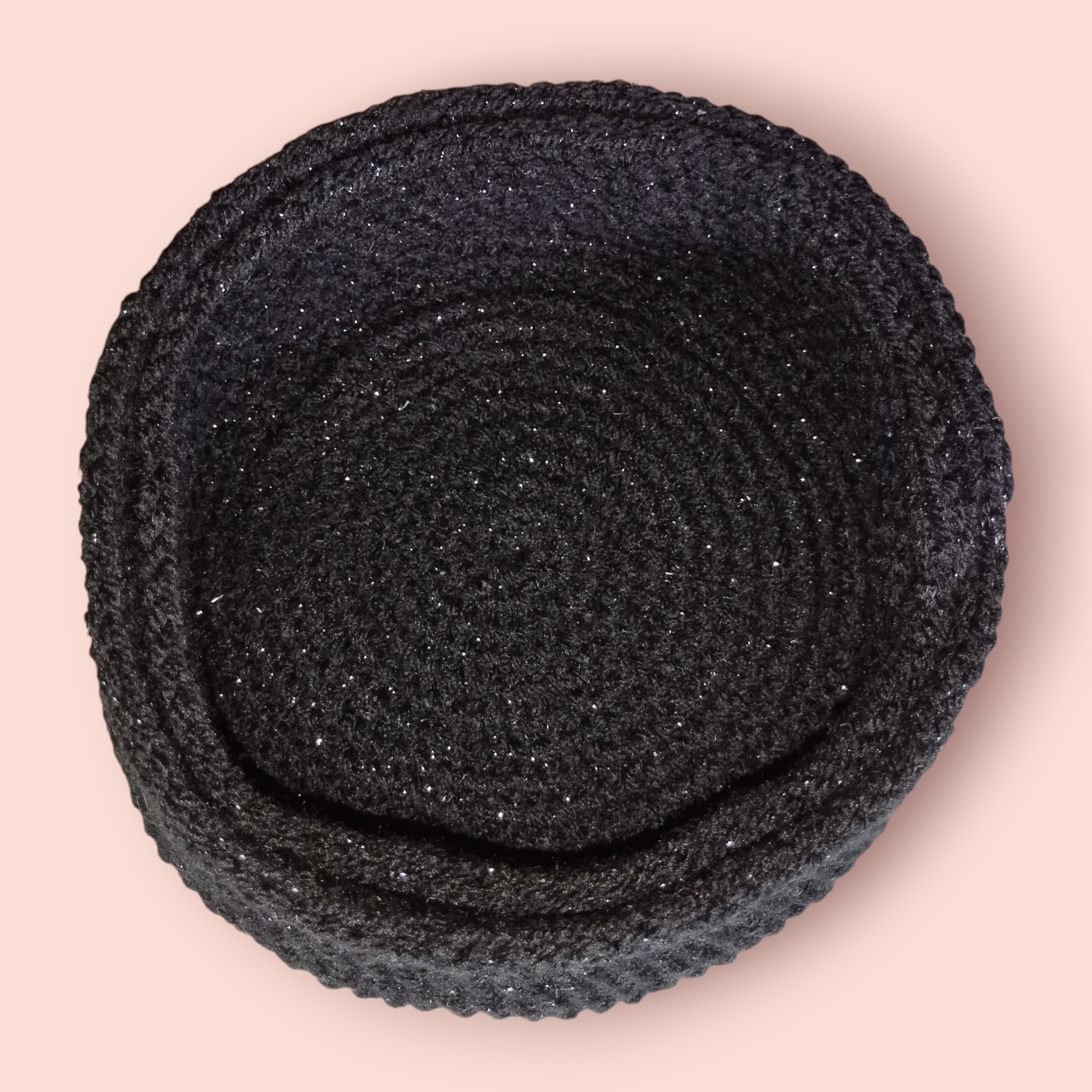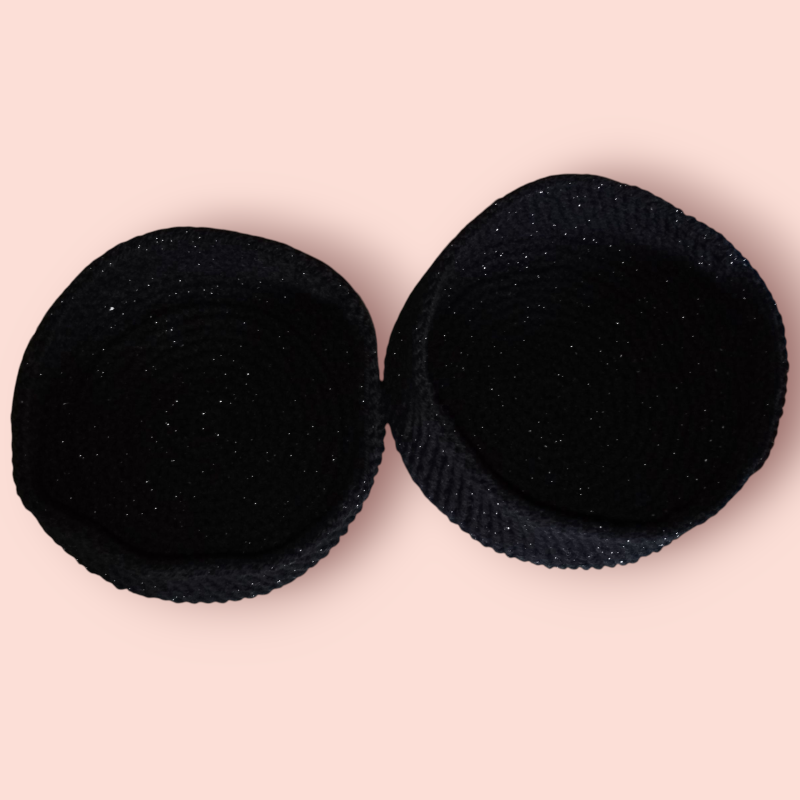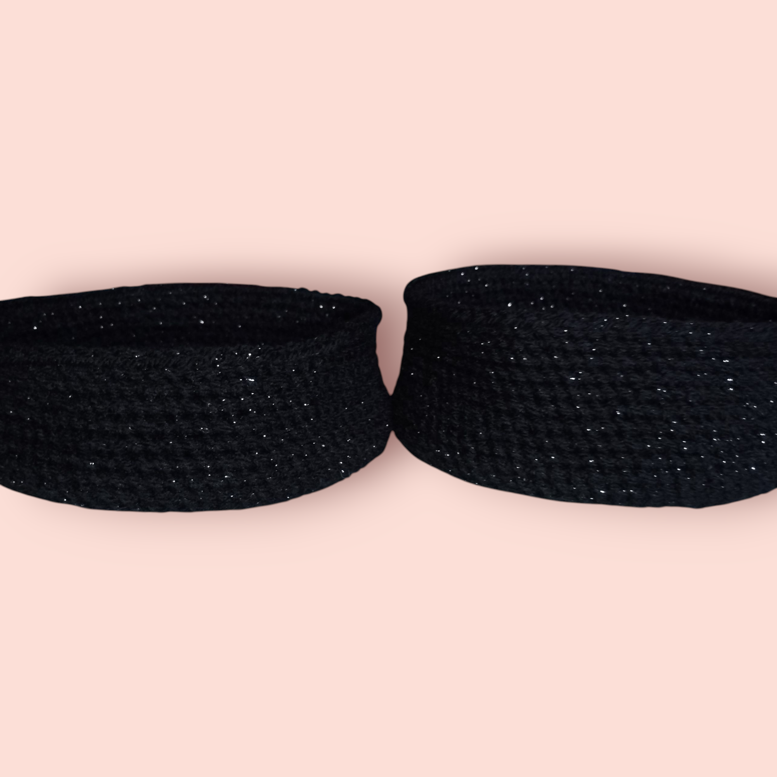 2 paniers gigognes noirs avec un fil métallisé, pratique pour le rangement dans la maison.